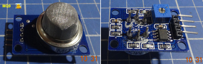 Gas sensor MQ9 detects the presence of CO (Carbon Monoxide), CH4 (Methane) and LPG in the air. The best results are given while compounds are in liquid form, however, it still does an amazing job when measuring in gas form. It needs a bit of time to warm up in order to work correctly.