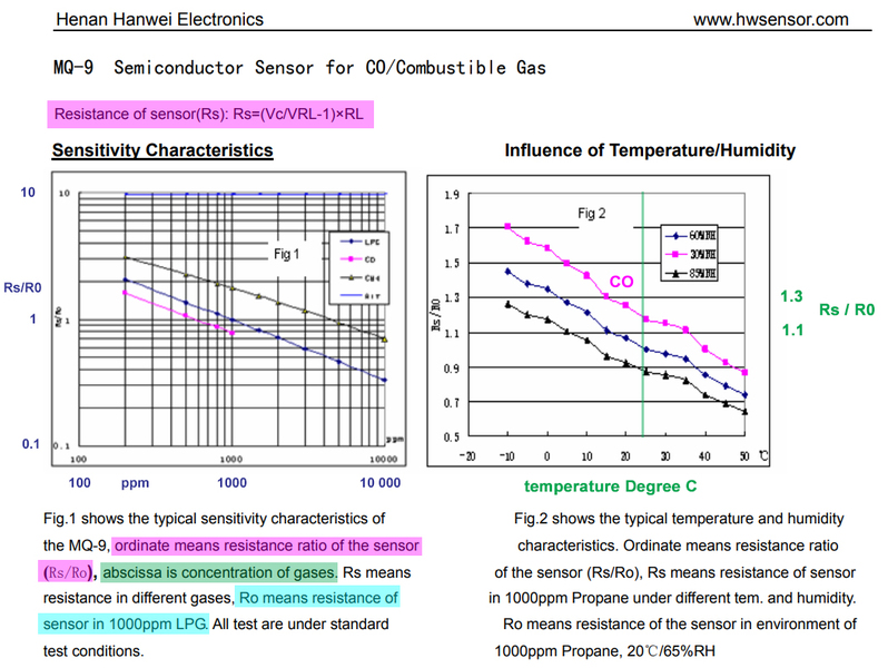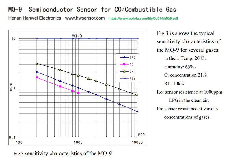 3. MQ9’s analog output voltage is in the range 0V to 5V, and varies to log scale of gas concentration.